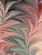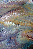 Late in the 20th century, marblers began experimenting with more modern inks and paints. The pattern here is a traditional Moiré in which both paper folding and paper delivery techniques contribute to the final result. Turkish in that respect, the resulting effect also resembles Japanese marbling in using only black and an ink that floats naturally on water rather than watercolor.
