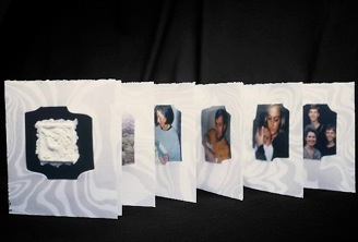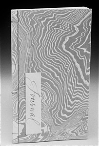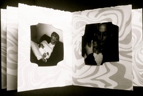 This accordion book was created to hold images taken of a Danish newborn’s first visit across the sea to meet her relatives in the United States. It can be read privately as a personal album or spread out as a display so all the family can be seen at once. On the cover is a trumpet-blowing angel hand cast in paper set on a piece of film negative. I hoped the suminagashi background throughout would suggest the ocean that both separates and connects the child and her American family.