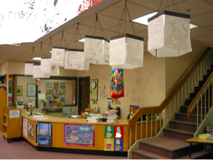 Suminagashi lanterns, made as part of a Japanese culture/creative writing (haiku) unit for 5th graders. The symbolism of light as metaphor for insight and knowledge was not lost--nine lanterns were installed in the school library.